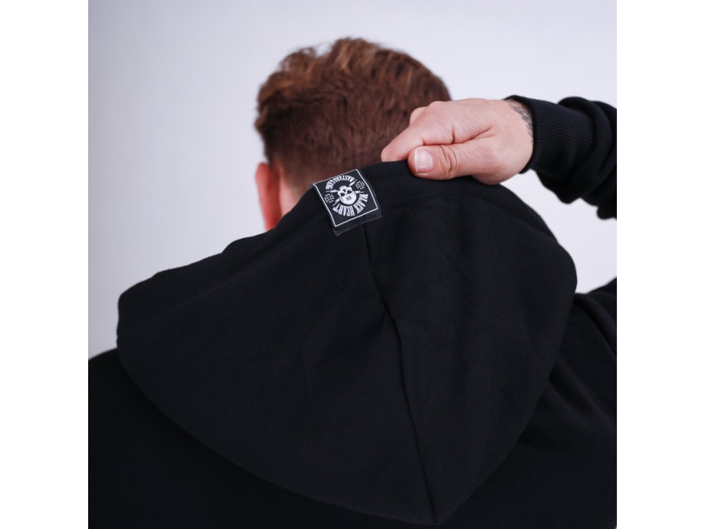 Mikina BLACK HEART SINNER s delším rovným střihem je vybavena dvěma kapsami na břiše a v přední části je opatřena celorozepínacím zipem. V neposlední řadě disponuje kapucí, kterou lze velikostně upravit pomocí tkaniček. Ty disponují stejně jako většina ostatních částí mikiny potiskem v rebelském stylu.