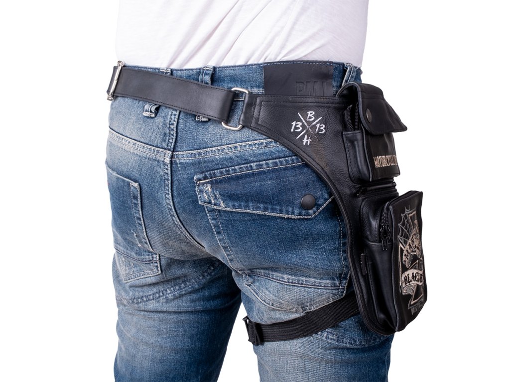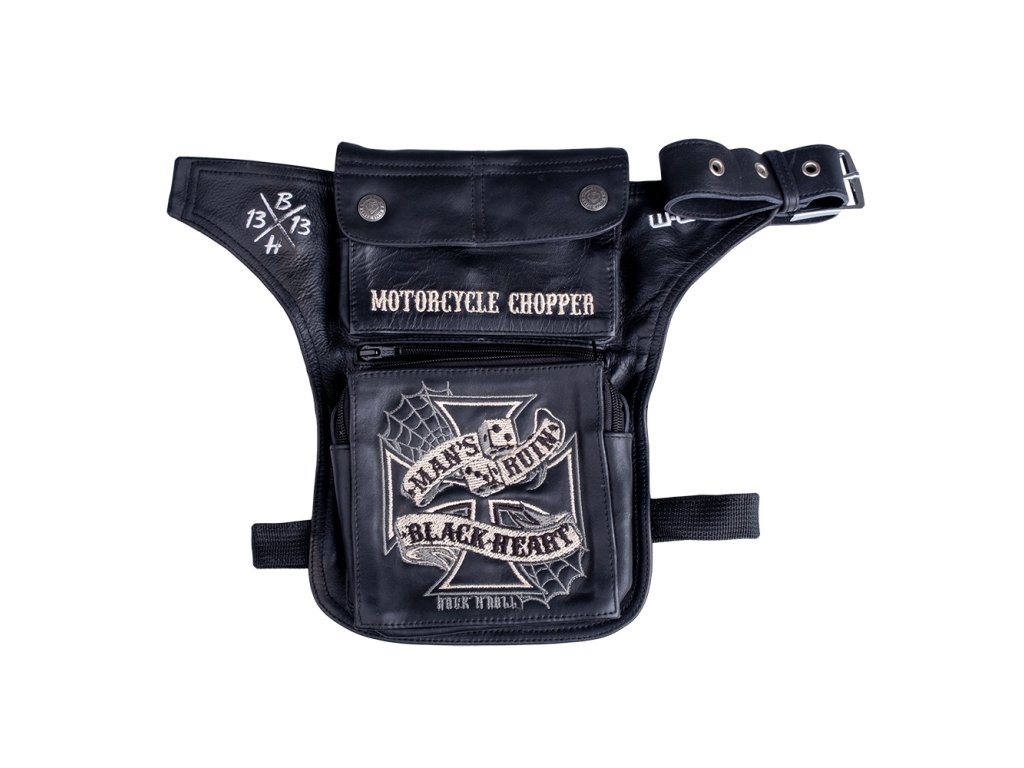 Stehenní kapsa W-TEC Man's Ruin je praktická přídavná externí kapsa z pravé hovězí kůže, kterou lze jednoduše připevnit na stehno. Na jejím originálním grafickém zpracování se značka W-TEC spojila s českým progresivním designérským brandem Black Heart. Našité motorkářské motivy tady tvrdí muziku! Opasek je také vyroben z kůže a pro nastavení velikosti využívá kovových přezek a pevnostních oček a je doplněn o textilní pásek na stehnu. Tato kapsa bude nápomocná pro rychlý přístup k dokladům, telefonu, peněžence, nářadí a podobně.
